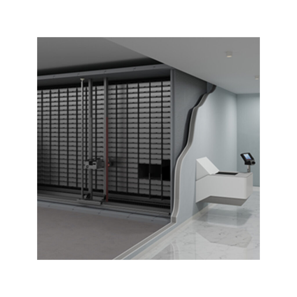 La doppia fila SSA Maxi è stata progettata specificamente per ottimizzare l’utilizzo di piccole superfici. Non solo consente un design più piccolo della camera blindata, ma offre anche una riduzione del carico di peso, ottenendo entrambi senza compromettere il numero di cassette disponibili. Nella configurazione standard a fila singola, un robot può prelevare una sola cassetta di deposito alla volta. Nella soluzione a doppia fila, due cassette possono essere prelevate dal robot. Ciò si ottiene impilando le scatole una dietro l’altra e collegandole con un gancio, assicurando che questo blocco compatto di cassette consenta la massima efficienza in termini di spazio occupato.